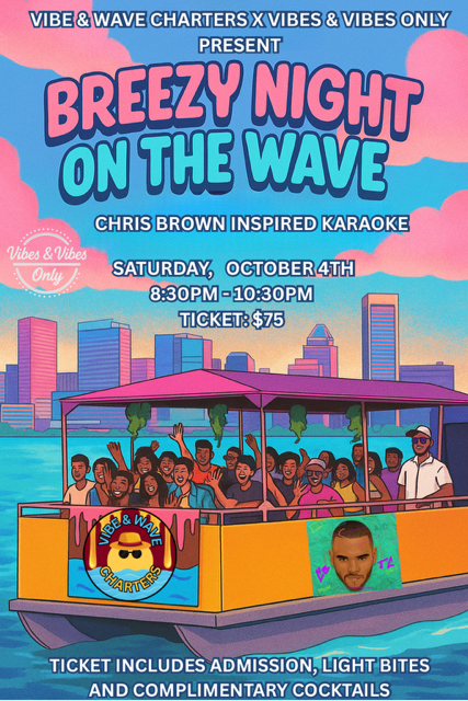 Vibe & Wave Charters X Vibes & Vibes Only Present: Breezy Night on the Wave - Chris Brown Inspired Karaoke! Enjoy light bites, complimentary cocktails, and all the good vibes while on the water. Get your fav Chris Brown karaoke song ready for Breezy Night on the Wave.  Let's see if you can Run It Run It, Get it on and Poppin, with Beautiful People since the Summer was Too Hot. Pre- Breezy bowl before his concert, and if you can't make the concert just enjoy a concert of your own but YOU are the STAR!
